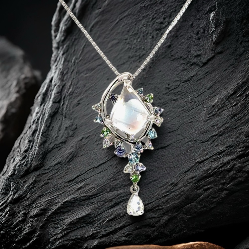 中心のムーンストンは、角度によって青白く光を反射し、まるで夜空に浮かぶ月のような神秘性を放ちます。