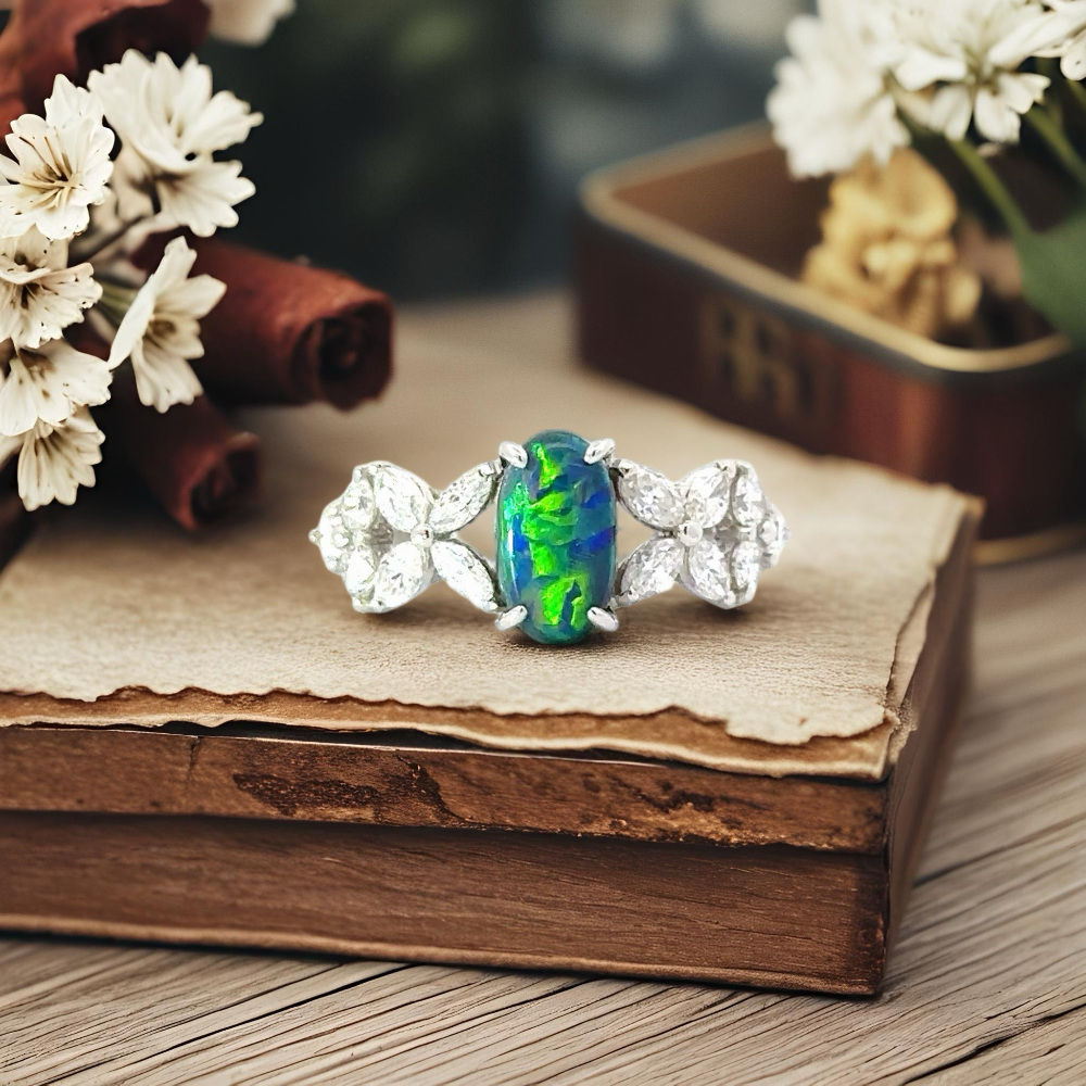 深海のように神秘的なブルーとグリーンが交差する1.161カラットのブラックオパールを主役に据えたラグジュアリーなリング。
