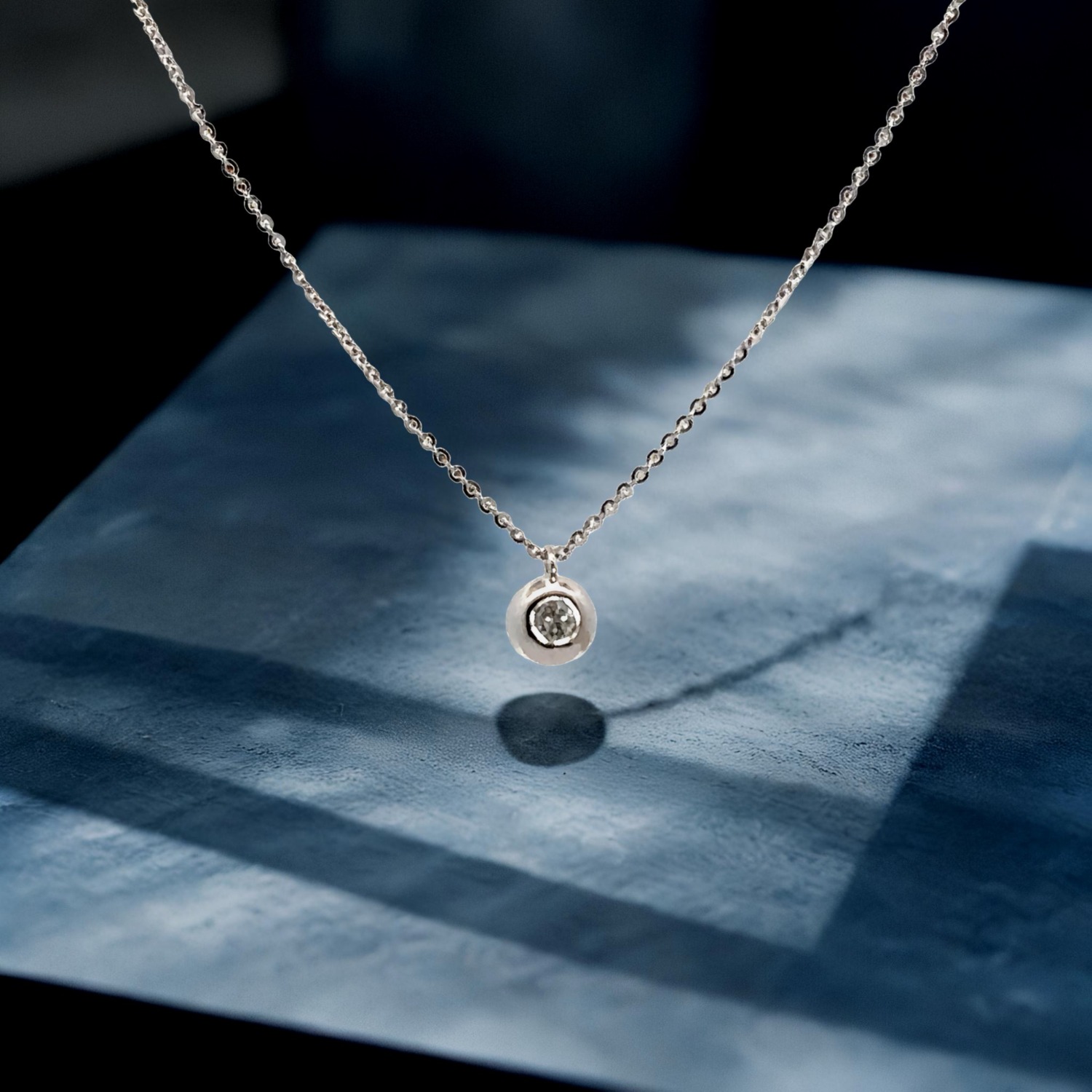 このネックレスの中心で眩いばかりの輝きを放つのは、厳選された0.05カラットのダイヤモンド。熟練の職人によって丁寧にセッティングされたダイヤモンドは、光を最大限に反射し、あなたの胸元でひときわ存在感を放ちます。