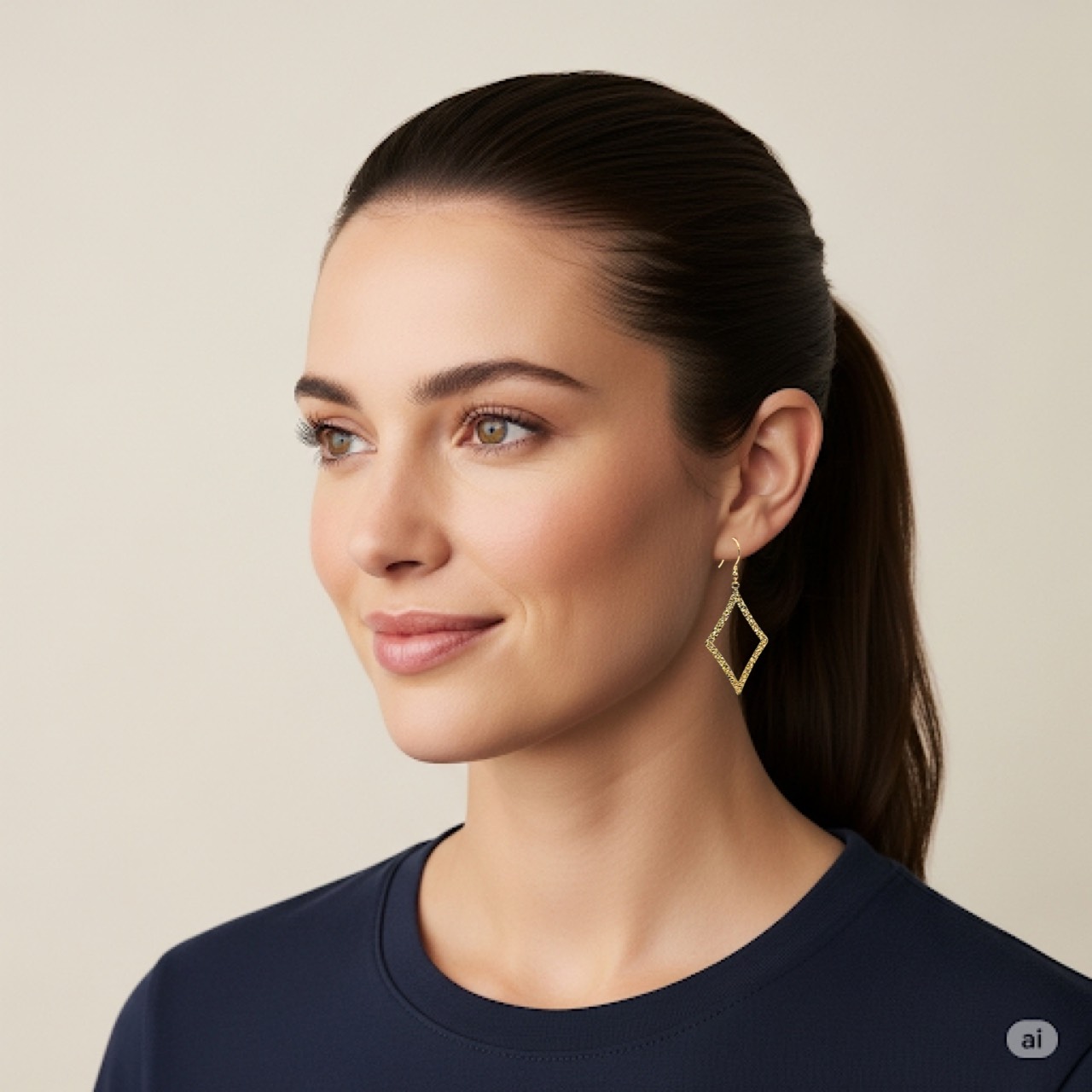 耳元で光を纏い、顔周りを華やかに彩るK18YGひし形ピアス。繊細なテクスチャーが施されたK18イエローゴールドのひし形モチーフが、光を受けるたびにキラキラと輝き、豊かな表情を演出します。